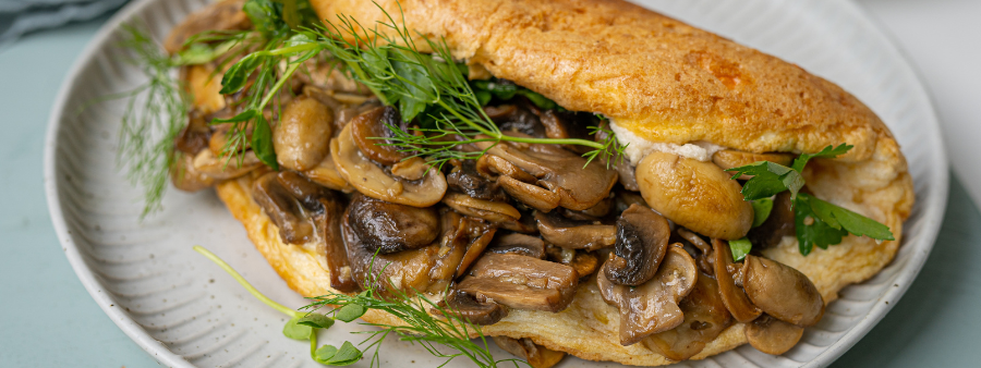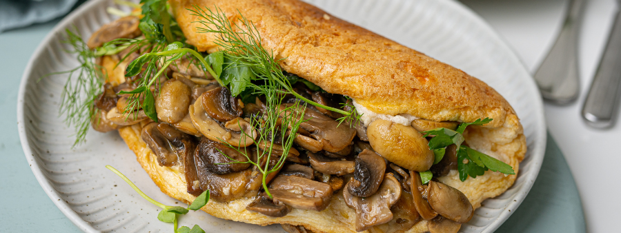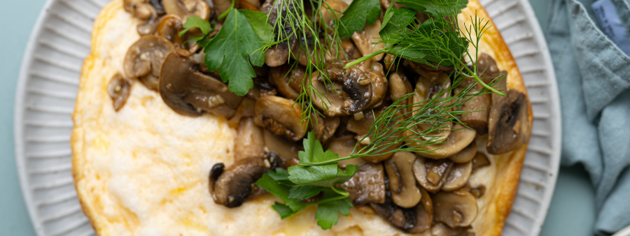 Transfer the souffle omelette to a plate. Top with the sauteed mushrooms and mixed herbs or snow pea shoots.