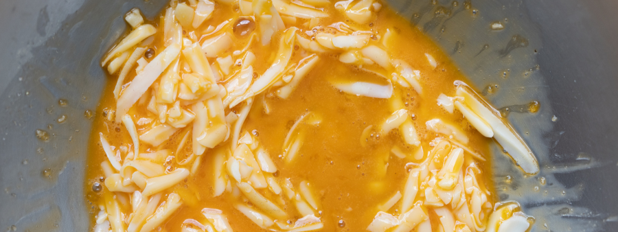 Add the grated cheese to the egg yolks. Mix to combine then gently fold the egg yolk mixture into the egg whites, being careful not to knock the air out.