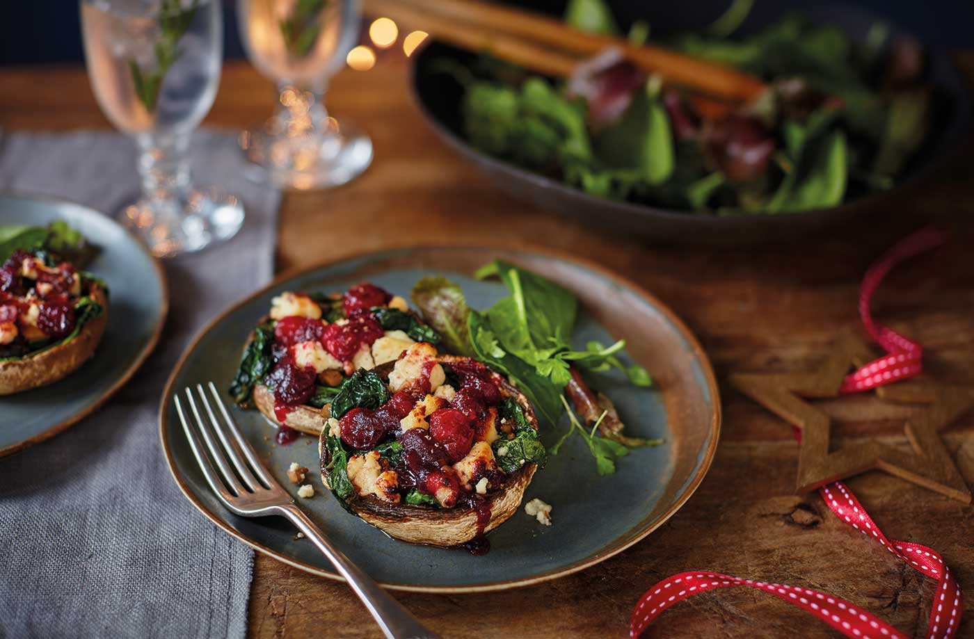Stuff mushrooms generously, top with optional walnuts or breadcrumbs.